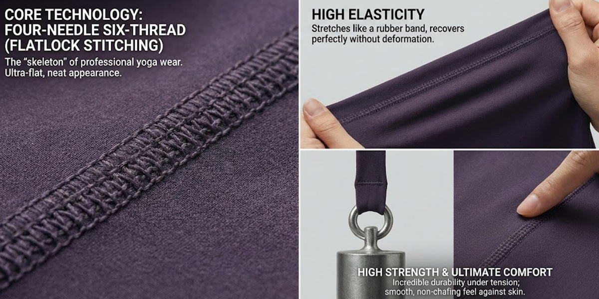 Before we look at shape and contour, we must look at structural integrity. The absolute standard for premium athletic apparel is the four-needle six-thread technique, commonly known in the industry as Flatlock Stitching.